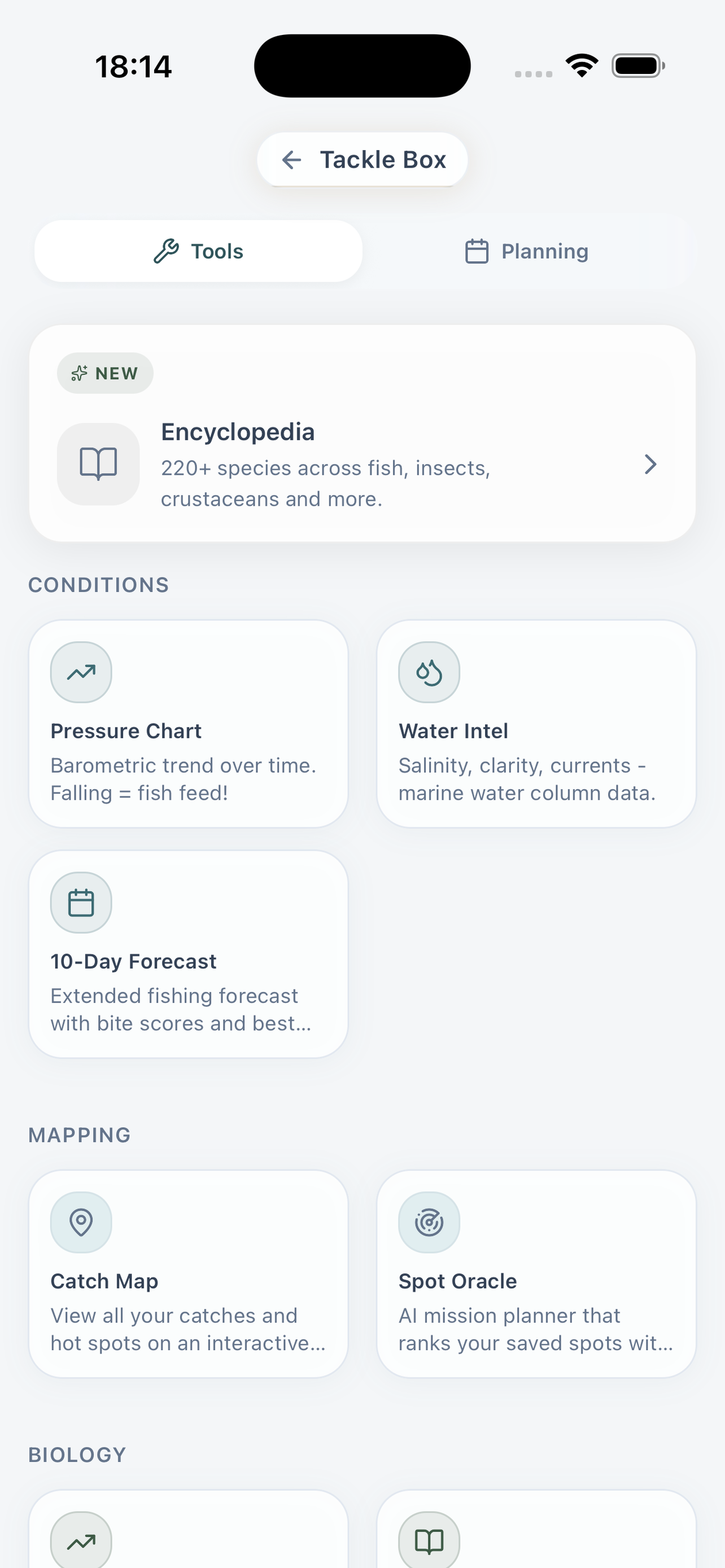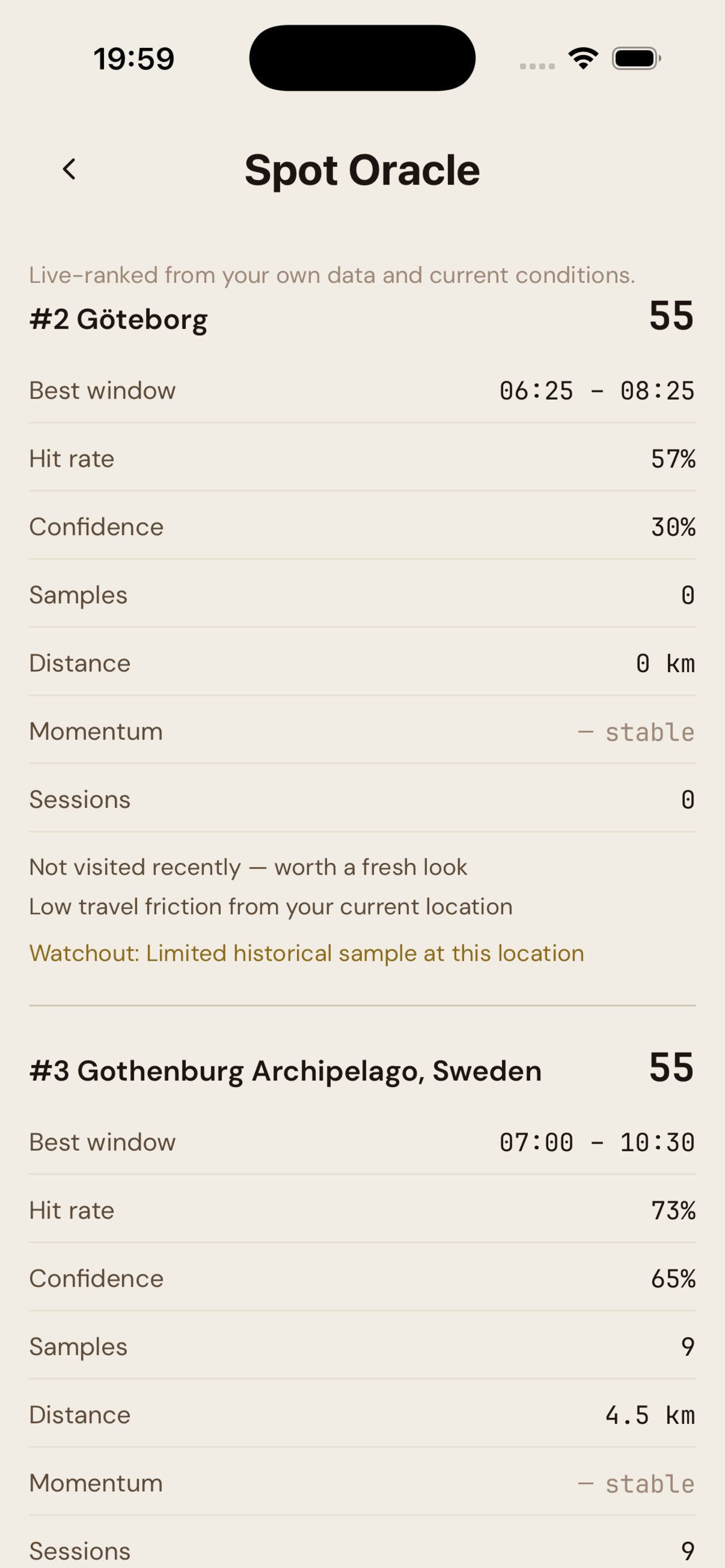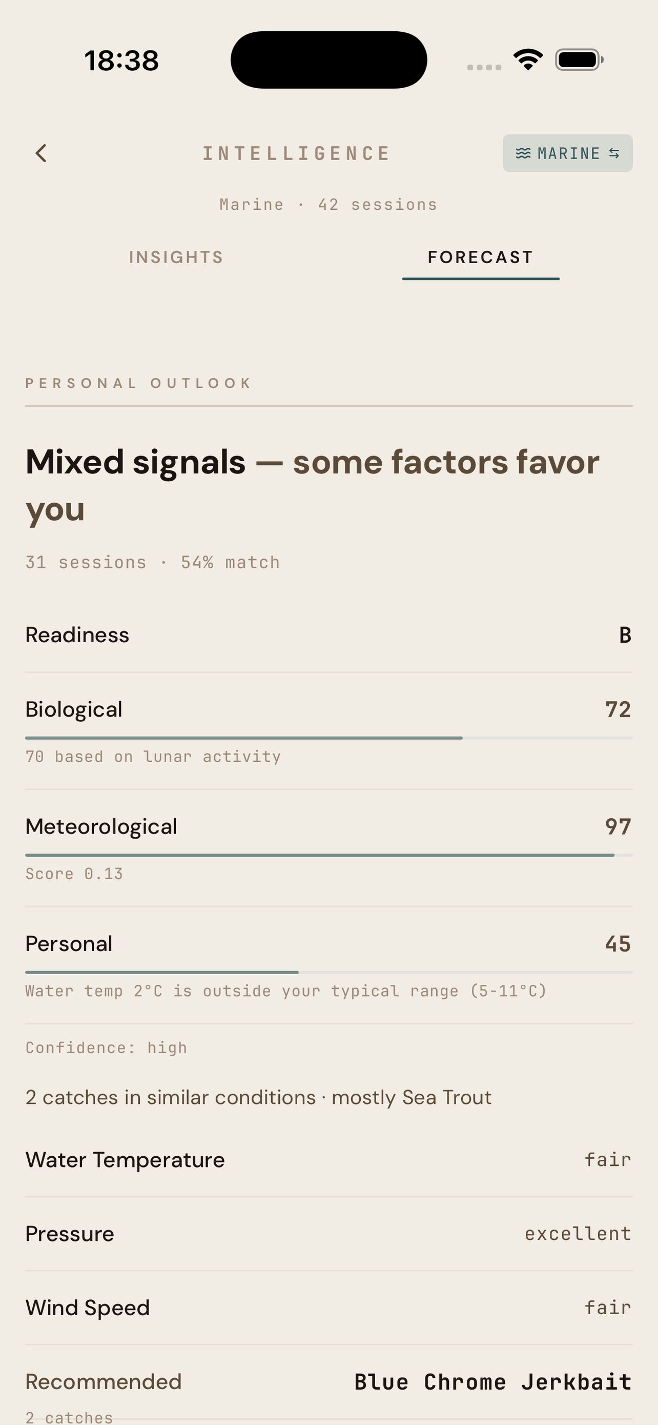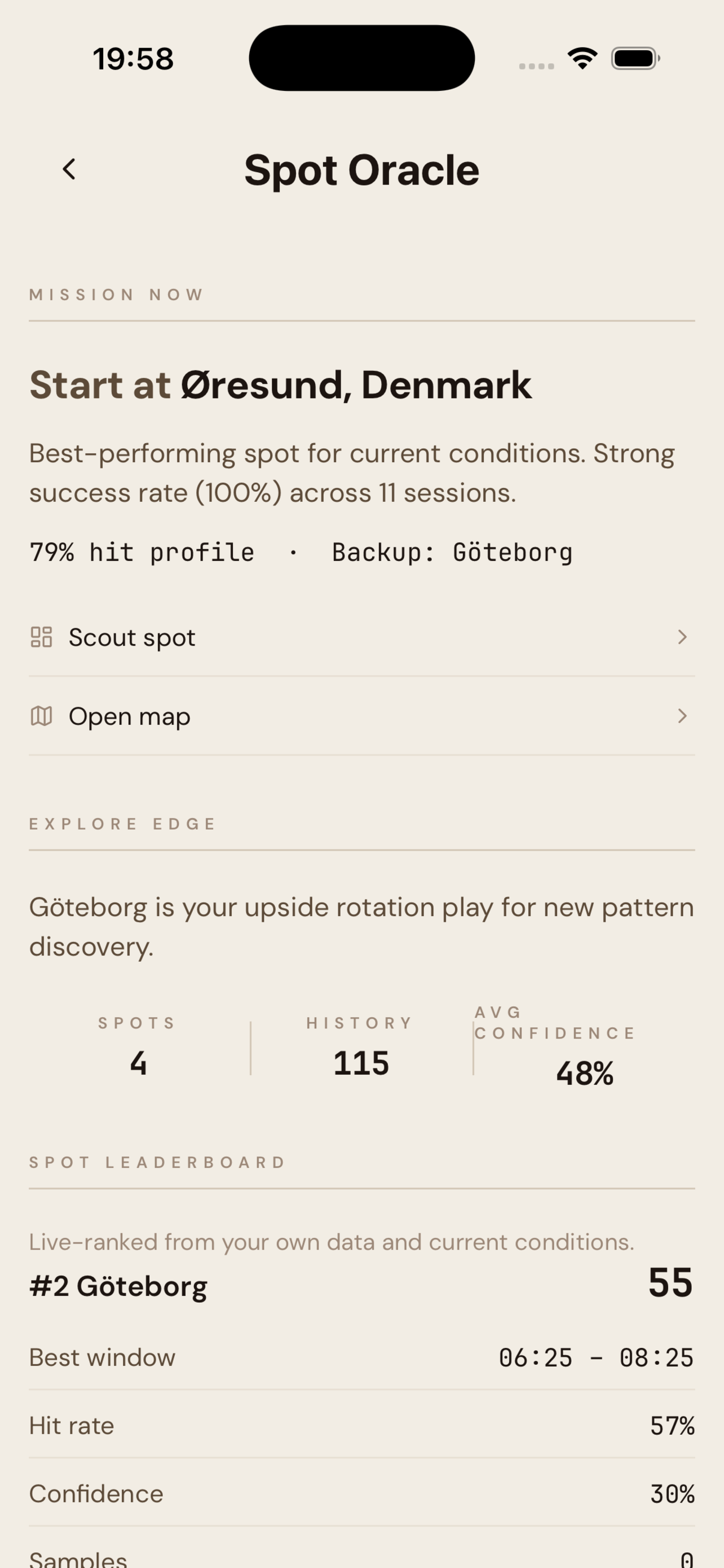 We tonen geen ruwe data en laten je het zelf uitzoeken. We wegen getij, temperatuur, maan, weer en soortgedrag — en geven je een gescoord venster met uitleg over wat de doorslag gaf.